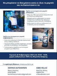 Την Κυριακή 25 Φεβρουαρίου η KONTECH AUTOMATION θα πραγματοποιήσει εκδήλωση με σκοπό να παρουσιάσει τα οφέλη των συνεργατικών ρομπότ της εξειδικευμένης εταιρείας ASBIS Hellas.