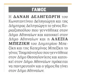 Πρόκειται για την ψυχοπαιδαγωγό Δανάη Δεληγεώργη και την ηθοποιό Αλεξία Μπεζίκη, όπως αναφέρεται στην αναγγελία που δημοσιεύθηκε στην εφημερίδα.