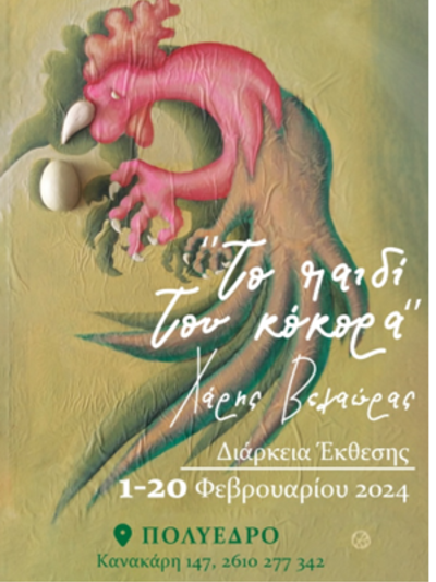 Ολοκληρώνεται στο φιλόξενο Πολύεδρο στην οδό Κανακάρη 147, στην Πάτρα το Σάββατο 24 Φεβρουαρίου η εικαστική έκθεση του συμπολίτη εικαστικού και νομικού Χάρη Βελαώρα με τίτλο «Το παιδί του κόκορα».