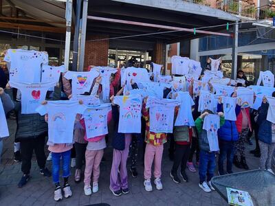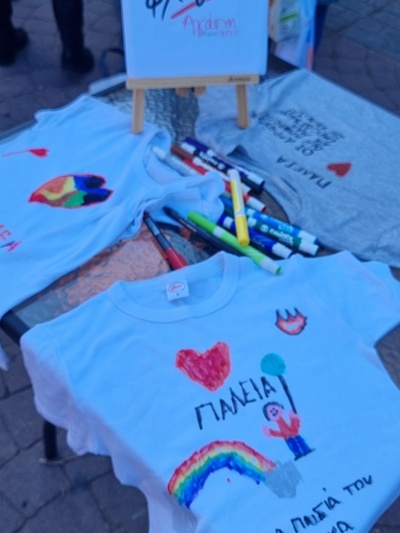 Μαθητές, γονείς και εκπαιδευτικοί ζωγράφισαν τα λευκά μπλουζάκια τους και άπλωσαν παντού ευτυχία. Παράλληλα λειτούργησε και το παζάρι που στήθηκε στην πλατεία τα έσοδα του οποίου δόθηκαν στη «Φλόγα».