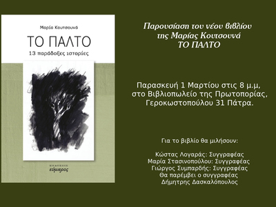 Αυτή την Παρασκευή 1η Μαρτίου 2024 στις 8 το βράδυ, στο βιβλιοπωλείο Πρωτοπορία στην οδό Γεροκωστοπούλου 31 πάνω από την Κανακάρη στην Πάτρα θα παρουσιαστεί το νέο βιβλίο της Μαρίας Κουτσουνά με τίτλο «Το Παλτό».