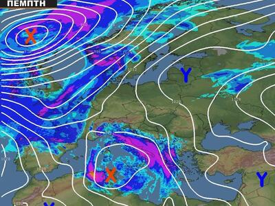 Στον πρώτο μας χάρτη αποτυπώνεται αυτό το βαρομετρικό χαμηλό με το γράμμα "Χ" μεταξύ νότιας Ιταλίας και βόρειας Αφρικής.