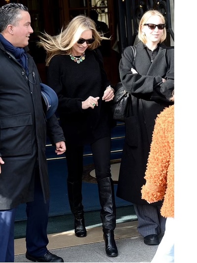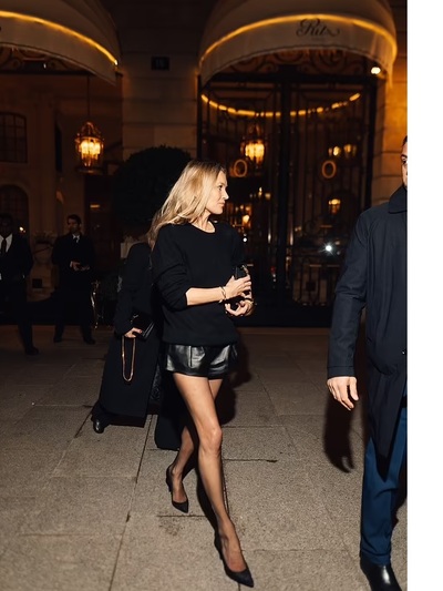 Η Μος βρέθηκε στην Paris Fashion Week διανυκτερεύοντας στο ξενοδοχείο Ritz, από όπου αναχώρησε μαυροντυμένη, με μακρύ φούτερ, κολάν και μπότες.