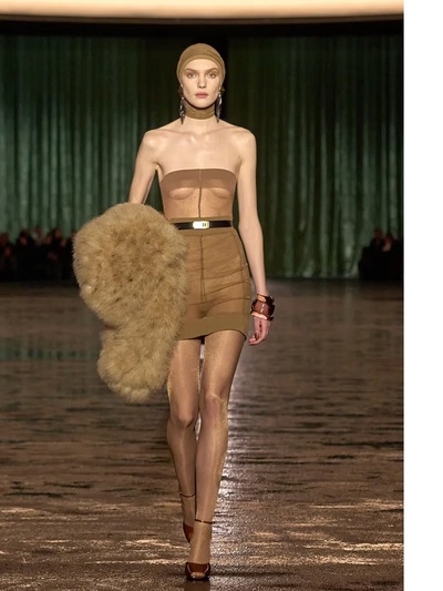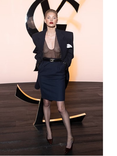 Στην πλατεία Jacques Rueffshe, κοντά στον Πύργο του Αιφελ, κάθισαν front row από την Κατρίν Ντενέβ και τη Σάρλοτ Ράμπλινγκ μέχρι τις Μόνικα Μπελούτσι, Λίντα Εβανγκελίστα, Κάρλα Μπρούνι, Εύα Ερτζιγκόβα, Ολίβια Γουάιλντ, Ζόε Κράβιτζ, Ζόε Σαλντάνα, Λίλι Κόλινς, Ελσα Χοσκ κ.α. Παρά τα εφαρμοστά, διάφανα outfits σε γήινους τόνους που ανέδειξαν τα καλλίγραμμα μοντέλα και τις stars που έδωσαν το παρόν χωρίς σουτιέν, μια ήταν η ντίβα που μαγνήτισε τα φλας: Η αμίμητη Κέιτ Μος.