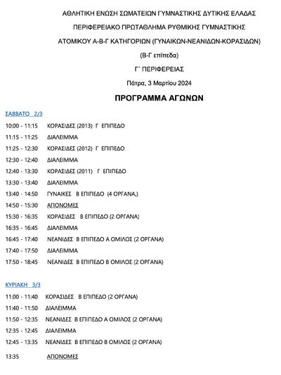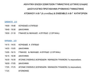 Η Γυμναστική Ομοσπονδία και η ΑΕΣΓ Δυτικής Ελλάδας σε συνεργασία με τον Δήμο Πάτρας διοργανώνουν το Σάββατο 2 Μαρτίου από 10.00 έως 21.00 και Κυριακή 3 Μάρτη από 11.00 έως 17.30 τους διασυλλογικούς και περιφερειακούς αγώνες Ρυθμικής Γυμναστικής Γ΄ περιφέρειας (Δυτ. Ελλάδος, Πελοποννήσου, Ιονίων Νήσων και Ηπείρου) στο κλειστό γυμναστήριο Ροϊτίκων.