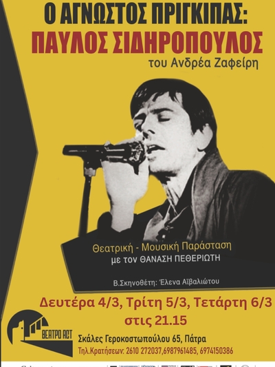 Η παράσταση με τα συνεχόμενα sold out, «Ο Άγνωστος Πρίγκιπας: Παύλος Σιδηρόπουλος» του Ανδρέα Ζαφείρη, περιοδεύει και φιλοξενείται για 2η χρονιά στο θέατρο Act στις σκάλες Γεροκωστοπούλου, για 3 μόνο βραδιές.