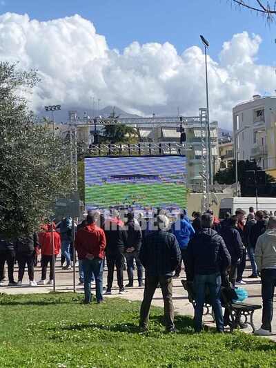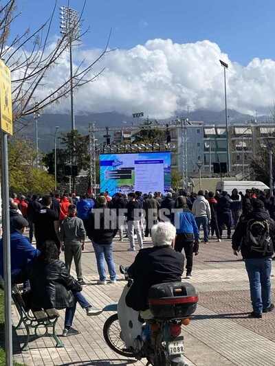 Σε γιγαντοοθόνες στην πλατεία Ντε Μιράντα έξω από το γήπεδο της Παναχαϊκής είδαν το κρίσιμο ματς με την Καλαμάτα οι φίλαθλοι της Παναχαϊκής, έξω από το γήπεδο της ομάδας αφού ο αγώνας έγινε κεκλεισμένων των θυρών.