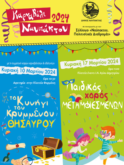 Ο κοντινός Δήμος Ναυπακτίας σε συνεργασία με τον Σύλλογο «Ναύπακτος: Πολιτιστικές Διαδρομές» προσκαλούν όλους σε δύο (2) μοναδικές αποκριάτικες εκδηλώσεις.