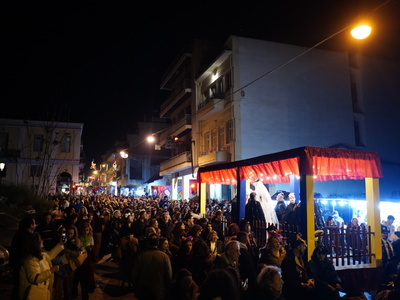 Όλοι μαζί θα κατηφορίσουν στην Κάτω Πόλη, στην πλατεία Γεωργίου Α΄. Εκεί ο πολιτιστικός σύλλογος «Γαϊτανάκι – Μπουρανί» του Τυρνάβου θα παρουσιάσει 20λεπτη παράσταση και στις 21.30 θα απευθύνουν χαιρετισμούς ο Δήμαρχος Πατρέων Κώστας Πελετίδης και ο Περιφερειάρχης Δυτικής Ελλάδος Νεκτάριος Φαρμάκης. Το γλέντι θα κορυφωθεί με συναυλία της παραδοσιακής Banda Entopica από τη Θεσσαλονίκη, που ενώνει κλαρίνο, σαξόφωνο, ακορντεόν, νταούλι και φωνές. Έχοντας ως βάση τους ήχους της Μακεδονίας, της Θράκης της Ηπείρου αλλά και όλης της Βαλκανικής Χερσονήσου, η μπάντα κινείται σε ρυθμούς χορευτικούς με τραγούδια παραδοσιακά αλλά και πρωτότυπες συνθέσεις. Η παραδοσιακή μουσική λειτουργεί άκρως διονυσιακά και δίνει στο κόσμο τη δυνατότητα να εξωτερικεύσει συναισθήματα που τόσο πολύ έχει ανάγκη.