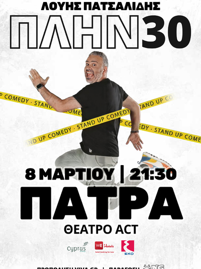 Μετά την επιτυχημένη περιοδεία της παράστασης «Made in Cyprus» σε Ελλάδα, Αγγλία, Βέλγιο, Ολλανδία και Καναδά και τις sold out εμφανίσεις του µε τον Αλέξανδρο Tσουβέλα σε Ελλάδα και Κύπρο την περσινή σεζόν, ο Λούης Πατσαλίδης παρουσιάζει την καινούργια του stand up παράσταση «ΠΛΗΝ 30» σε μια περιοδεία ανά την Ελλάδα και υπόσχεται να μας κάνει να γελάσουμε μέχρι δακρύων. Με τον εκρηκτικό του χαρακτήρα, το ανατρεπτικό χιούμορ και τον καυστικό του λόγο, ο δημοφιλής κωμικός δεν αφήνει τίποτα ασχολίαστο. Το μενού του είναι πληθωρικό, όπως άλλωστε και ο ίδιος.