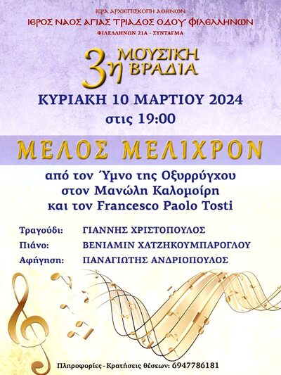 Αυτή την Κυριακή 10 Μαρτίου 2024, και ώρα 7 το απόγευμα, θα πραγματοποιηθεί η συναυλία με τον τίτλο: ΜΕΛΟΣ ΜΕΛΙΧΡΟΝ.