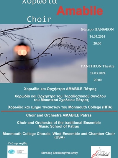 Η Χορωδία και Ορχήστρα AMABILE, μαζί με την Χορωδία και Ορχήστρα του Παραδοσιακού συνόλου του Μουσικού σχολείου Πάτρας και την Χορωδία και το Wind Ensemble του Monmouth College (ΗΠΑ), θα δώσουν μια ξεχωριστή συναυλία την Πέμπτη 14.3.2024 στις 20:00, στο θέατρο Πάνθεον της Πάτρας, στη Δημ. Γούναρη.