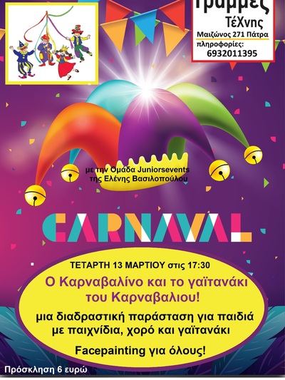 Μια Καρναβαλοπαρέα περιμένει μικρούς και μεγάλους την Τετάρτη 13 Μαρτίου στις 17:30, στο Θέατρο Γραμμές Τέχνης (Μαιζώνος 271, έναντι σταθμού τρένου) για μια μόνο διαδραστική παράσταση με την Ομάδα Juniorsevents.