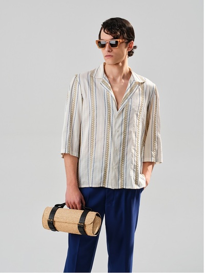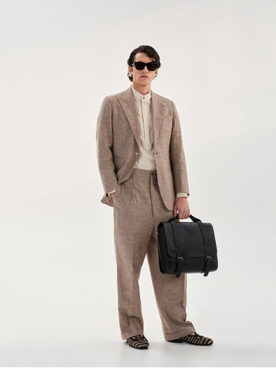 Προτείνονται λινά κοστούμια, σακάκια σε γραμμή κλεψύδρας, παντελόνια ψηλοκάβαλα με side adjusters που σφίγγουν τη μέση, πανοφώρια, κασκέτα. Ο oίκος Χριστάκης συνεργάστηκε στην κατασκευή του oversized πουκαμίσου «Pera», με το μυτερό γιακά. Συνέπραξαν επίσης το εργαστήριο Bespoke Athens, το Design House MINAS by Prometheus και το ατελιέ χειροτεχνίας του Αριστείδη Τζονευράκη από το Άργος. Τα σανδάλια τύπου fisherman, δημιουργήθηκαν ειδικά από τα Ancient Greek Sandals.