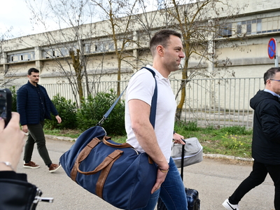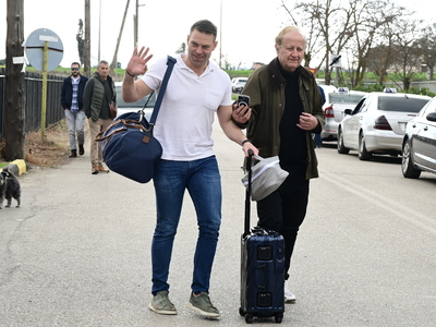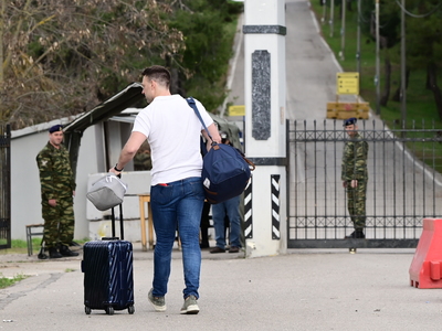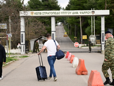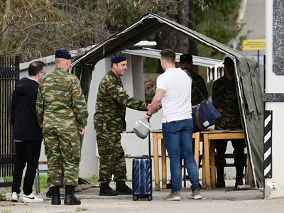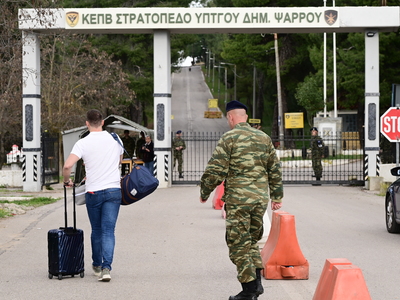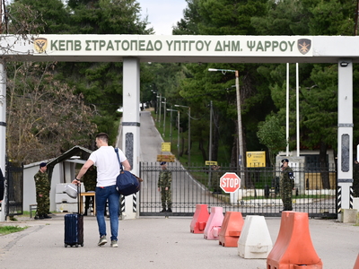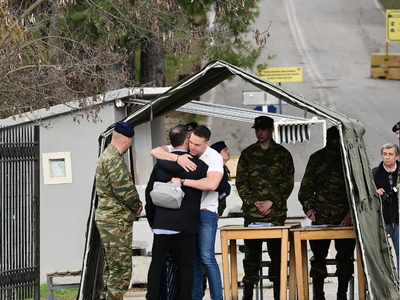 Την πύλη του στρατοπέδου στη Θήβα πέρασε ο πρόεδρος του ΣΥΡΙΖΑ, Στέφανος Κασσελάκης για να παρουσιαστεί στον στρατό (στις 16:00) με τον κόσμο να τον χαιρετά και να τον αγκαλιάζει.