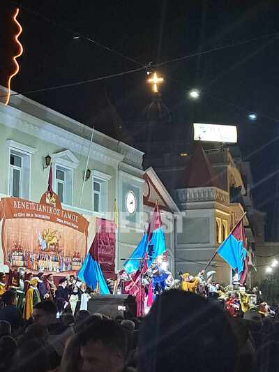 Η μεγαλειώδης πομπή του Βενετσιάνικου γάμου, αρχίζει από τη πλατεία του Αγίου Παύλου, στη συνέχεια διασχίζει την οδό Αλεξάνδρου Ρώμα, και καταλήγει στην πλατεία του Αγίου Μάρκου. Ακολούθως πραγματοποιείται, με τις απαραίτητες τιμές, η τελετή του γάμου παρουσία του νοδάρου (συμβολαιογράφου). Αξίζει να σημειωθεί ότι η μεγαλειώδης πομπή του γάμου ανοίγει με τυμπανιστές και σημαιοφόρους. Ακολουθούν οι νεόνυμφοι και οι κοντινοί συγγενείς τους. Η νόνα (γιαγιά) μεταφέρεται μέσα σε λεντίκα (κλειστό φορείο εξαιρετικής τέχνης μέσα στο οποίο μετέφεραν τους ευγενείς) ενώ, ακολουθούν τα σεντούκια της νύφης με τα προικιά. Την πομπή πλαισιώνουν οι προσκεκλημένοι, οι οποίοι φορούν ακριβή αντίγραφα στολών του 16ου αιώνα, ενώ κορίτσια κρατούν κάνιστρα με ροδοπέταλα και μπομπονιέρες. Στην συνέχεια ακολουθεί το γαμήλιο γλέντι, με αναγεννησιακούς χορούς και πολλά τοπικά παραδοσιακά εδέσματα όπως είναι τα ζαχαροκούκα (κουφέτα), ορτζάδες (σουμάδα) και πάντολες (παντεσπάνι).
