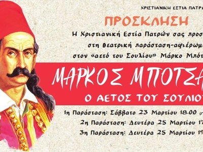 Η Χριστιανική Εστία Πατρών (Κανάρη 58) προσκαλεί το κοινό να παρακολουθήσει τη θεατρική παράσταση – αφιέρωμα στον αετό του Σουλίου "Μάρκο Μπότσαρη" αυτό το Σάββατο και την Δευτέρα 25/3/2924.