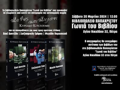 Το βιβλιοπωλείο Παπαχρίστου -Γωνιά του Βιβλίου στην οδό Αγ. Νικολάου 32 στην Πάτρα προσκαλεί το αναγνωστικό κοινό να γνωρίσει από κοντά τον συγγραφέα της νέας αστυνομικής σειράς βιβλίων «Με Φως & Μελάνι» που κυκλοφορούν από τις εκδόσεις By the Book, Κυριάκο Κουζούμη.