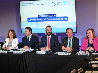 Η ανάγκη ισχυροποίησης των πολιτικών συνοχής της Ευρωπαϊκής Ένωσης και ευθυγράμμισής τους με τις ανάγκες και τις προκλήσεις που αντιμετωπίζουν οι ευρωπαϊκές Περιφέρειες, ήταν το μήνυμα που βγήκε από τη συνεδρίαση του Πολιτικού Γραφείου της CPMR (Δίκτυο Παράκτιων Περιφερειών της Ευρώπης) που πραγματοποιήθηκε σήμερα, Παρασκευή 22 Μαρτίου 2024 στον ιστορικό χώρο της Αχάϊα Κλάους στην Πάτρα.