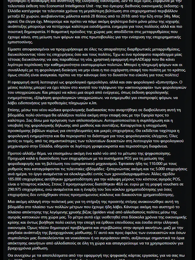 Προτού αλλάξω θέμα, να επισημάνω ακόμη ένα καλό νέο από το μέτωπο της ψηφιοποίησης. Προχωρά καλά η διασύνδεση των επιχειρήσεων με τα συστήματα POS για τη μείωση της φοροδιαφυγής και τη βελτίωση του εισπρακτικού μηχανισμού. Έφτασαν ήδη τις 110.000 με τους ρυθμούς που καταγράφονται τις τελευταίες εβδομάδες -ξεπερνώντας ακόμη και τις 5.000 επιχειρήσεις ανά ημέρα, το έργο αναμένεται να ολοκληρωθεί εντός των χρονοδιαγραμμάτων. Άλλες σχεδόν 185.000 επιχειρήσεις αιτήθηκαν χρηματοδότηση για την κάλυψη μέρους του κόστους αγοράς POS, είναι ο τέταρτος κύκλος. Στους 3 προηγουμένους διατέθηκαν 40,6 εκ. ευρώ με τη μορφή vouchers σε 290.975 επιχειρήσεις, ενώ αναμένεται και η έναρξη του 5ου κύκλου χρηματοδότησης για όσες επιχειρήσεις δεν εντάχθηκαν στους προηγούμενους κύκλους και δικαιούνται χρηματοδότησης.