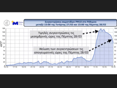 Όπως διακρίνεται και στο παρακάτω γράφημα, οι συγκεντρώσεις σωματιδίων PM10 ξεπέρασαν τα 180 μg/m³ στις 12:30 και έκτοτε σταδιακά υποχωρούν, όπως αναμενόταν άλλωστε και με βάση τα προγνωστικά στοιχεία του μοντέλου μεταφοράς σκόνης DUST/METEO του Εθνικού Αστεροσκοπείου Αθηνών.