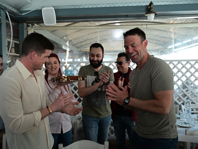Τούρτα έκπληξη περίμενε τον Πρόεδρο του ΣΥΡΙΖΑ-ΠΣ Στέφανο Κασσελάκη στη Θήβα μετά την Ορκωμοσία του. Στο πλευρό του ο σύζυγός του, Τάιλερ Μακμπέθ.