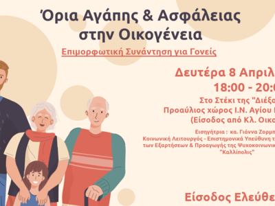 Τα μέλη της Εθελοντικής Ομάδας «ΔΙΕΞΟΔΟΣ ΑΙΓΙΟΥ» σε συνεργασία με το Κέντρο Πρόληψης των Εξαρτήσεων και Προαγωγής της Ψυχοκοινωνικής Υγείας Π.Ε Αχαΐας «Καλλίπολις» θα υλοποιήσουν επιμορφωτική συνάντηση για γονείς στο Στέκι της Ομάδας στον προαύλιο χώρο της εκκλησίας του Αγίου Παντελεήμονα στο Αίγιο (είσοδος από Κλ. Οικονόμου) στις 8 Απριλίου 6-8 μ.μ με θέμα: «Όρια αγάπης και ασφάλειας στην οικογένεια».