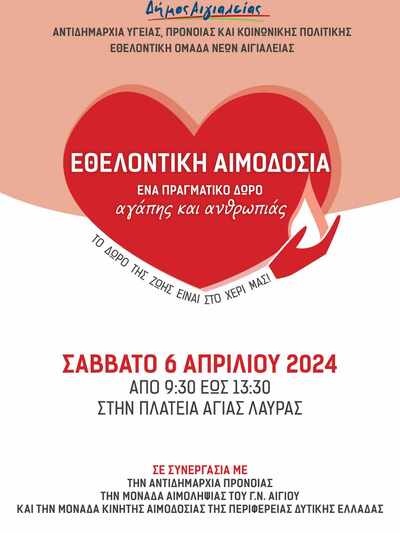 Εθελοντική αιμοδοσία διοργανώνουν ο Δήμος Αιγιαλείας-Αντιδημαρχία Υγείας, Πρόνοιας και Κοινωνικής Πολιτικής και η Εθελοντική Ομάδα Νέων Αιγιαλείας, αυτό το Σάββατο 6 Απριλίου από τις 9.30 π.μ. έως τη 1.30 μ.μ. στην Πλατεία Αγίας Λαύρας στο Αίγιο.