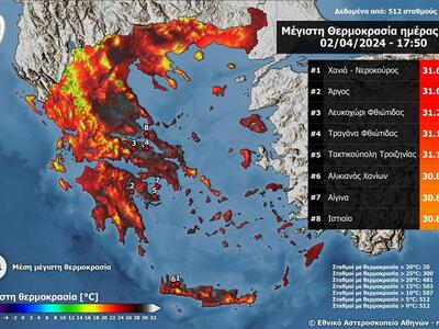 Σε ακραία υψηλά επίπεδα κυμάνθηκε η θερμοκρασία και την Τρίτη (2/4), όπως κατέγραψε το δίκτυο αυτόματων μετεωρολογικών σταθμών του Εθνικού Αστεροσκοπείου Αθηνών / Meteo.gr.