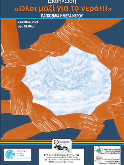 Με αφορμή την Παγκόσμια Ημέρα Νερού το Μουσείο Επιστημών και Τεχνολογίας και το Τμήμα Γεωλογίας του Πανεπιστημίου Πατρών, οι Διευθύνσεις Πρωτοβάθμιας και Δευτεροβάθμιας Εκπαίδευσης Αχαϊας-Περιβαλλοντική Εκπαίδευση και η Περιφέρεια Δυτικής Ελλάδας ενώνουν τις δυνάμεις τους για το νερό. ΄Εχοντας συνειδητοποιήσει ότι «μόνο εάν γνωρίζω υπάρχει πιθανότητα να νοιαστώ και να προστατεύσω τη φυσική κληρονομιά», μουσειακή και περιβαλλοντική εκπαίδευση μαζί, μέσω βιωματικής προσέγγισης και αλληλεπίδρασης με τη φυσική κληρονομιά έχουν τη δύναμη να συμβάλλουν στην κατανόηση και τη γνώση, ενημερώνοντας παράλληλα την κοινωνία.