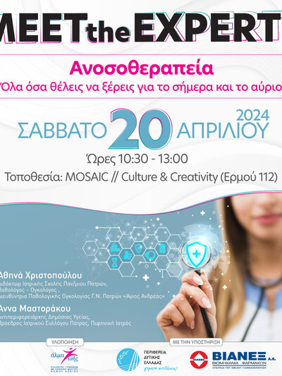Οι συναντήσεις αυτές με τον τίτλο «MEET THE EXPERTS», διοργανώνονται από τον Σύλλογο Γυναικών με καρκίνο Μαστού «Άλμα Ζωής Ν. Αχαΐας» και είναι εντελώς δωρεάν για όποιον επιθυμεί να συμμετέχει.