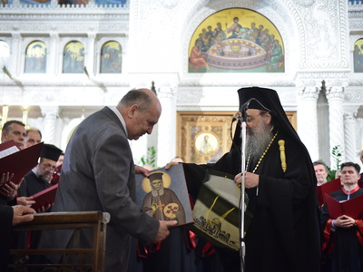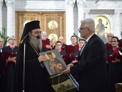 Στο τέλος και πριν την αναμνηστική φωτογραφία όλων των συμμετεχόντων, ο σεβασμιότατος Μητροπολίτης Πατρών κ.κ. Χρυσόστομος χάρισε εικόνες του προσφάτως Αγιοποιηθέντος Αγ. Γερβασίου στους χοράρχες και ένα βιβλίο του Αγ. Ανδρέα στον πρόεδρο της χορωδίας «Θεόδωρος Φωκαεύς» κ. Γεώργιο Βέργο. Αναμνηστικά δώρα έδωσε ο Μητροπολίτης Πατρών επίσης στα μέλη και των δύο χορωδιών.