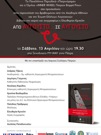 Το Πανελλήνιο Περιοδικό "Πατρινόραμα"και ο Όμιλος INNER WHEEL Πατρών Βορρά Ρίου, διοργανώνουν την παρουσίαση του βραβευμένου από την Ακαδημία Αθηνών και την Ένωση Ελλήνων Λογοτεχνών, βιβλίου της ιατρού και συγγραφέως Ελευθερίας Κρικέλη "Από Αύγουστο σε Αύγουστο" το Σάββατο 13 Απριλίου και ώρα 19.30 στο ξενοδοχείο Μy Way στην Πάτρα.