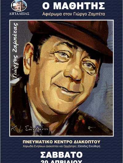 Η Αντιδημαρχία Πολιτισμού και Αθλητισμού του Δήμου Αιγιαλείας και η Χορωδία Ενηλίκων Διακοπτού Αιγιαλείας προσκαλούν το κοινό σε ένα μουσικό αφιέρωμα στον μεγάλο λαϊκό συνθέτη Γιώργο Ζαμπέτα.