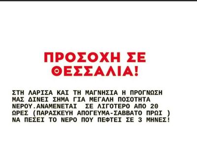 «Προσοχή σε Θεσσαλία. Στη Λάρισα και τη Μαγνησία η πρόγνωση μας δίνει σήμα για μεγάλη ποσότητα νερού. Αναμένεται σε λιγότερο από 20 ώρες να πέσει το νερό που πέφτει σε 3 μήνες!» γράφει χαρακτηριστικά.