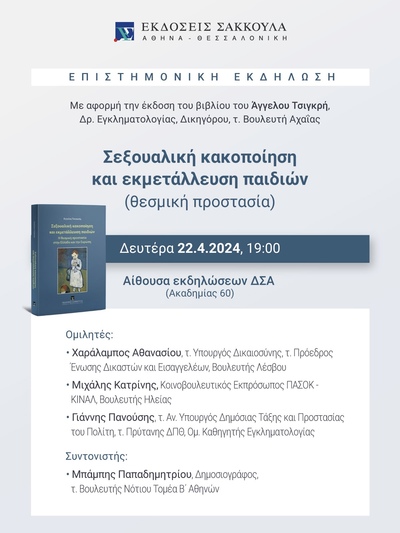 Τη Δευτέρα 22 Απριλίου και ώρα 7 μμ, θα παρουσιαστεί στην Αθήνα το νέο βιβλίο του Αχαιού πολιτικού, δικηγόρου και γνωστού εγκληματολόγου Άγγελου Τσιγκρή με τίτλο: “Σεξουαλική Κακοποίηση και Εκμετάλλευση Παιδιών: Η Θεσμική Προστασία στην Ελλάδα και την Ευρώπη”, το οποίο κυκλοφορεί από τις εκδόσεις Σάκκουλα.