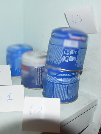 - φιαλίδια υγραερίου (γκαζάκια), κενές γυάλινες φιάλες, στουπιά, πλαστικά μπιτόνια με υπολείμματα βενζίνης και κροτίδα μεγάλης ισχύος, πρόσφορα για την κατασκευή