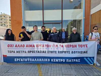 Το Εργατουπαλληλικό Κέντρο Πάτρας στο πλαίσιο μιας σειράς δράσεων εν όψει της μεγάλης απεργίας της Πρωτομαγιάς πραγματοποίησε σήμερα Δευτέρα παράσταση διαμαρτυρίας στην Επιθεώρηση Εργασίας (ΝΕΟ Πατρών 12) απαιτώντας άμεσα μέτρα υγιεινής και ασφάλειας, προστασίας της ζωής των εργαζομένων σε όλους τους χώρους δουλειάς, άμεση ένταση των ελέγχων από τις αρμόδιες υπηρεσίες για να μην θρηνούμε σχεδόν κάθε μέρα και ένα νεκρό συνάδελφό μας όπως γίνεται το τελευταίο διάστημα.