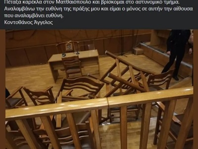 Με μια του ανάρτηση στο Facebook, ο άνδρας που πέταξε την καρέκλα στο άκουσμα των ποινών για την τραγωδία στο Μάτι, λέει πως αναλαμβάνει την ευθύνη, αναφέροντας πως βρίσκεται στο αστυνομικό τμήμα.