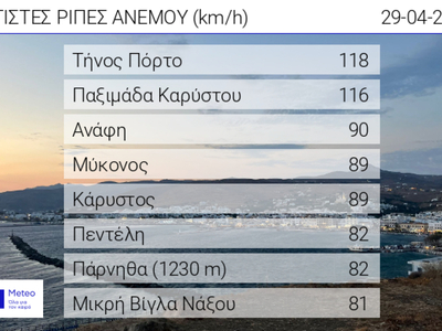 Σύμφωνα με το δίκτυο αυτόματων μετεωρολογικών σταθμών του meteo.gr/Εθνικού Αστεροσκοπείου Αθηνών, ενίσχυση παρουσίασαν οι βόρειοι άνεμοι στο Αιγαίο τη Μεγάλη Δευτέρα 29 Απριλίου 2024, με ριπές που έφτασαν τα 118 km/h στο Πόρτο Τήνου και τα 116 km/h στην Παξιμάδα Καρύστου.