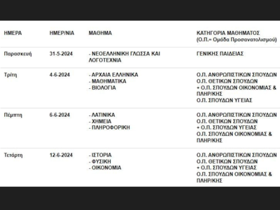 Συγκεκριμένα, φέτος, οι εξετάσεις ξεκινούν στις 31 Μαΐου και τελειώνουν στις 12 Ιουνίου και το πρόγραμμα έχει διαμορφωθεί ανάλογα για τις ευρωεκλογές που πέφτουν στις 9 Ιουνίου 2024.