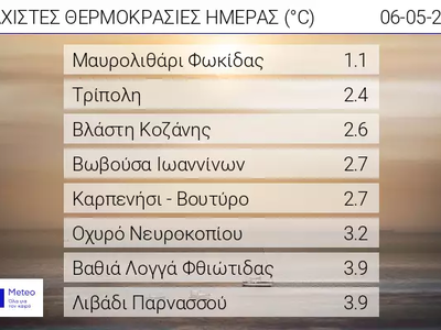 Στον πίνακα παρουσιάζονται οι 8 σταθμοί του δικτύου αυτόματων μετεωρολογικών σταθμών του meteo.gr / Εθνικού Αστεροσκοπείου Αθηνών που κατέγραψαν τις χαμηλότερες θερμοκρασίες το πρωί της Δευτέρας (6/5/24).