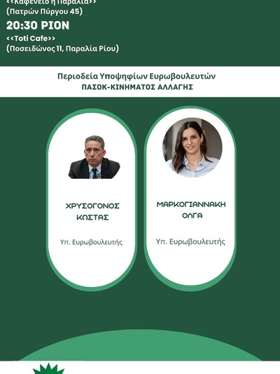 Αύριο Παρασκευή 10 Μαΐου με αφορμή τον εορτασμό της Ζωοδόχου Πηγής στο Αίγιο, θα βρεθούν οι υποψήφιοι Ευρωβουλευτές με το ΠΑΣΟΚ, Όλγα Μαρκογιανννάκη και Κωνσταντίνος Χρυσόγονος. Σύμφωνα με την ανακοίνωση, θα παραστούν στις παρακάτω εκδηλώσεις -δράσεις: