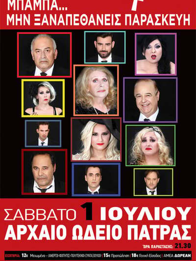 Στο «Μπαμπά Μην Ξαναπεθάνεις Παρασκευή» το καλοκαίρι του 2017 έπαιζαν οι Μπέσυ Μάλφα, Δημήτρης Μαυρόπουλος, Σοφία Μουτίδου, η Άννα Παναγιωτοπούλου, ο Θωμάς Πανδής, ο Αχαιός στην καταγωγή ηθοποιός Νίκος Πολυδερόπουλος, ο Αλέξανδρος Ρήγας, ο Πρόδρομος Τοσουνίδης, ο Θανάσης Τούμπουλης, ο Παύλος Χαϊκάλης και οι Παρθένα Χοροζίδου, Κωνσταντία Χριστοφορίδου.