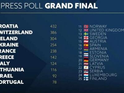Όπως ήταν αναμενόμενο Κροατία και Ελβετία ήταν εκείνες που κέρδισαν τις εντυπώσεις των δημοσιογράφων, συγκεντρώνοντας 432 και 386 πόντους αντίστοιχα.