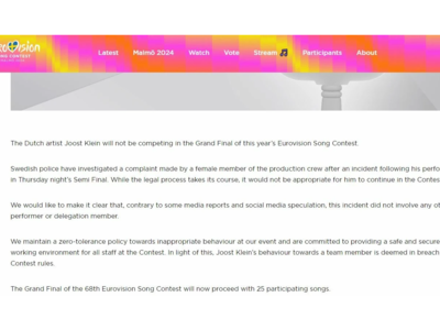 «Ο Ολλανδός καλλιτέχνης Joost Klein δεν θα διαγωνιστεί στον Μεγάλο Τελικό του φετινού Διαγωνισμού Τραγουδιού της Eurovision.