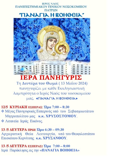 Το Πανεπιστημιακό Νοσοκομείο Πατρών “Παναγιά η Βοήθεια”, εορτάζει με κάθε Εκκλησιαστική λαμπρότητα την Ιερά σύναξη της Παναγίας της Βοήθειας!