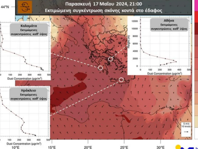 Σύμφωνα με το μοντέλο πρόγνωσης συγκέντρωσης σκόνης του Εθνικού Αστεροσκοπείου Αθηνών/meteo.gr, για την Παρασκευή 17/05 αναμένονται αυξημένες συγκεντρώσεις σκόνης κοντά στο έδαφος στα δυτικά και νότια τμήματα της χώρας μας, ενώ στα κεντρικά και βόρεια τμήματα οι υψηλότερες συγκεντρώσεις θα εντοπίζονται σε μεγαλύτερα υψόμετρα. Στον χάρτη που ακολουθεί παρουσιάζονται οι εκτιμώμενες συγκεντρώσεις σκόνης κοντά στο έδαφος για τις βραδινές ώρες της Παρασκευής 17/05 στο σύνολο της χώρας, ενώ τα ενσωματωμένα διαγράμματα απεικονίζουν τις συγκεντρώσεις σκόνης καθ’ ύψος σε τρεις επιλεγμένες πόλεις (Αθήνα, Καλαμάτα, Ηράκλειο).