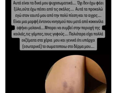 Πιο συγκεκριμένα, η Έλενα Ασημακοπούλου ανήρτησε φωτογραφίες της, στις οποίες μας δείχνει τις μελανιές τα πόδια της που έχουν προκληθεί από το άγχος.