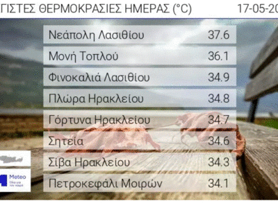 Απογειώθηκε ο υδράργυρος σήμερα Παρασκευή (17.05.2024) στην Κρήτη με τη θερμοκρασία να θυμίζει Ιούλιο εξαιτίας των συνθηκών που προκάλεσε η αφρικανική σκόνη.
